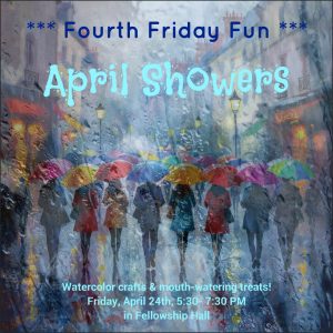 « All Events Fourth Friday Fun: April Showers April 24 @ 5:30 pm - 7:30 pm « Easter Sunday Special Concert Make One, Take One, card making party » Add to calendar Google Calendar iCalendar Outlook 365 Outlook Live Details Date: April 24 Time: 5:30 pm - 7:30 pm